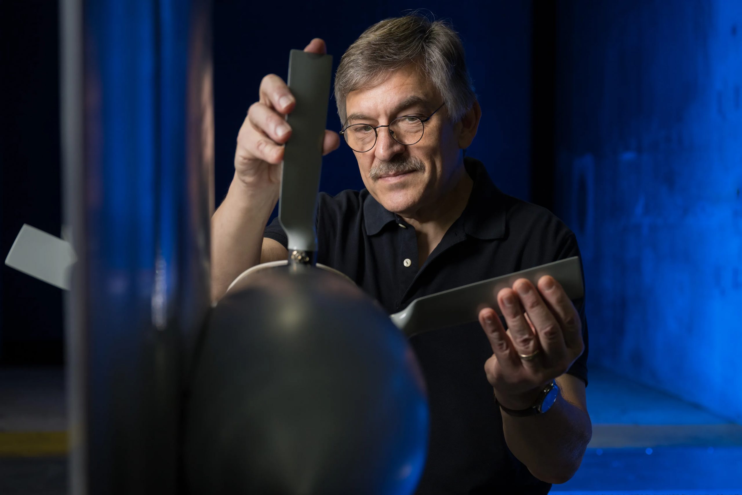 The model was mounted on a turntable inside the wind tunnel, so the team could collect data at different wing tilt angles, flap positions, and rotation rates. The team also varied the tunnel wind speed and adjusted the relative positions of the propellers.